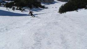 Entweder vom "Hotel Hochschneeberg" querend in die Flanke oder direkt von der Hochfläche (40°-44°). Beliebig durch einige kleine Engstellen in die breite Flanke unterhalb der Felsen. Die nun breite Rinne abwärts, die sich in der Waldzone verengt bis zu einem Felsabbruch (1325m). Unmittelbar vorher orografisch rechts weg und eben ca. 100 m zur roten Markierung des unteren Herminensteiges. Querung bis zur "östlichen Hotelries". Von dort entweder den nachfolgenden Felsabbruch abklettern oder rechts umgehen (rot markiert). Weiter durch den Wald ins Mieseltal bis ins Schneebergdörfl.