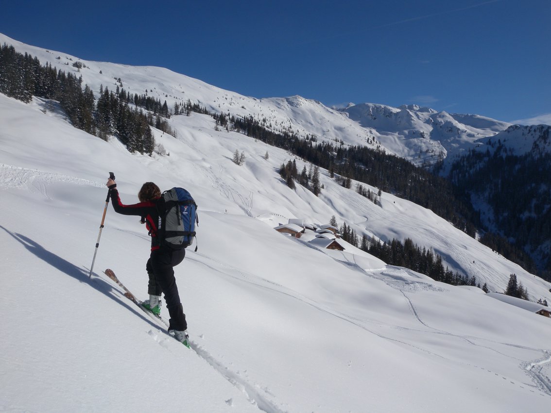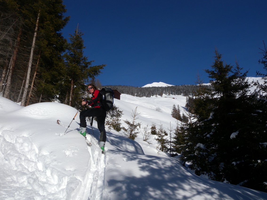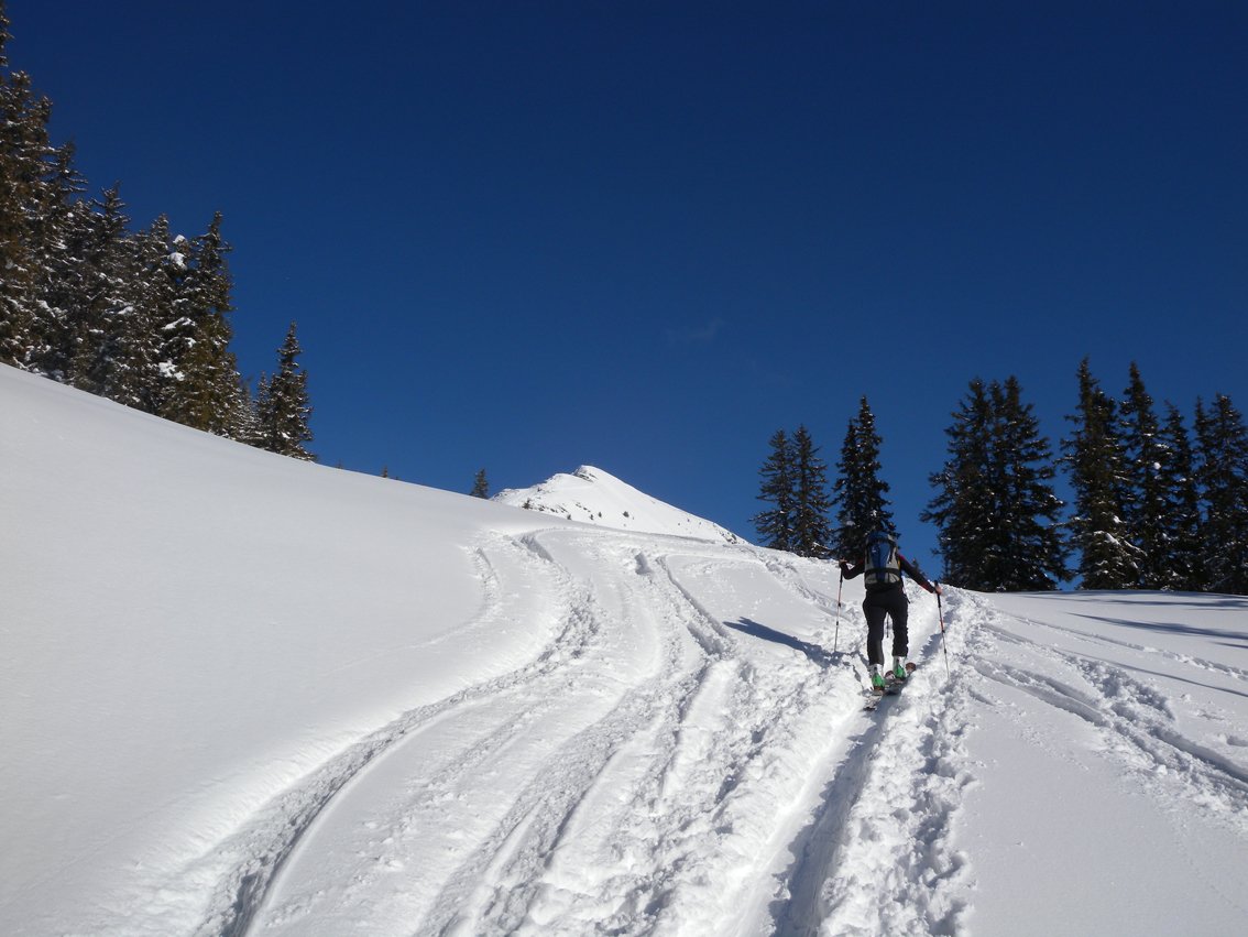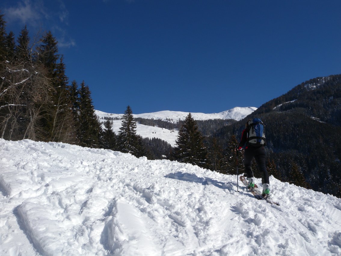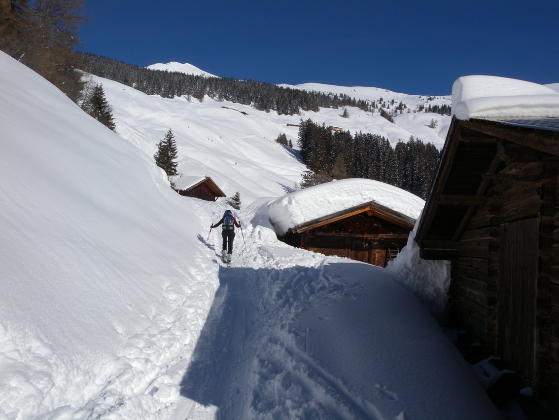 Bei vernünftiger Spurlage kaum lawinengefährlich. Oben ist der Serpentinenweg oft mit dem Pistengerät gewalzt.