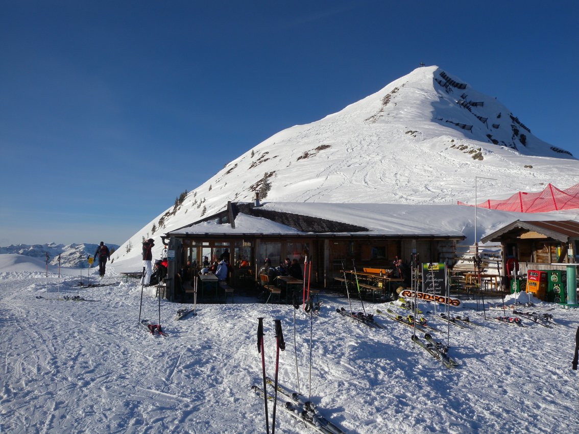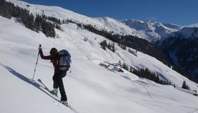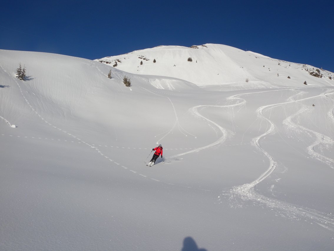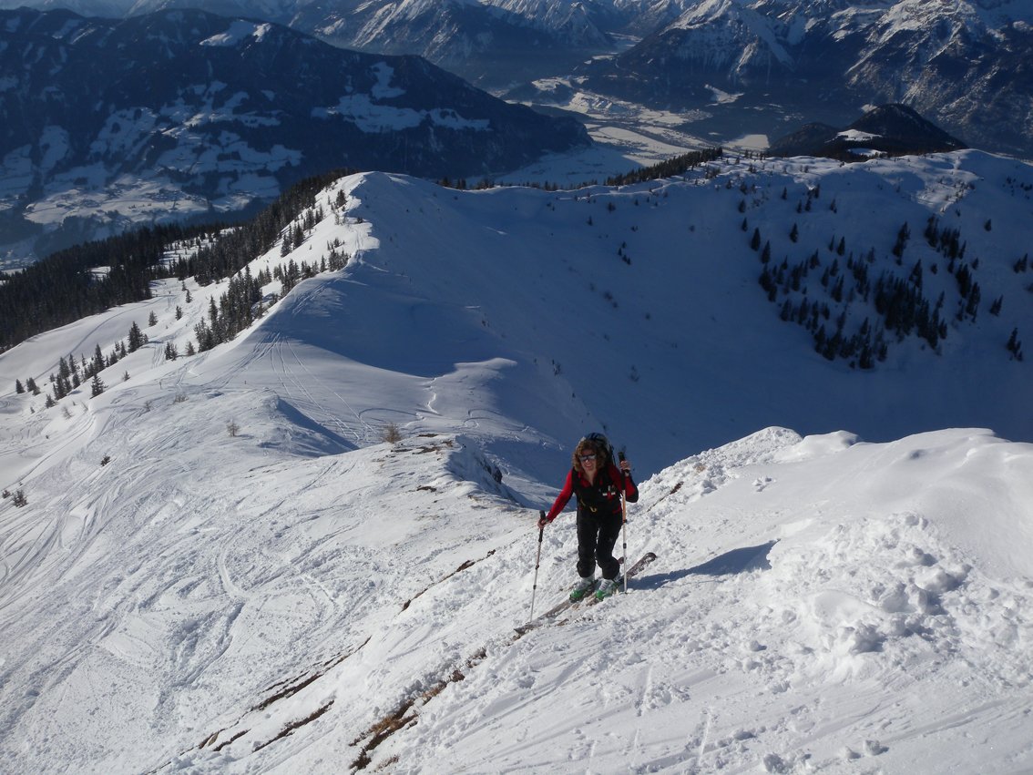 Abfahrt: Oben wird meist zur Hütte bei der Bergstation abgefahren, dann rechts hinunter zur Aufstiegsspur. Bei sicheren Schneeverhältnissen kann man auch gleich direkt vom Gipfel über die SW-Flanke abfahren.