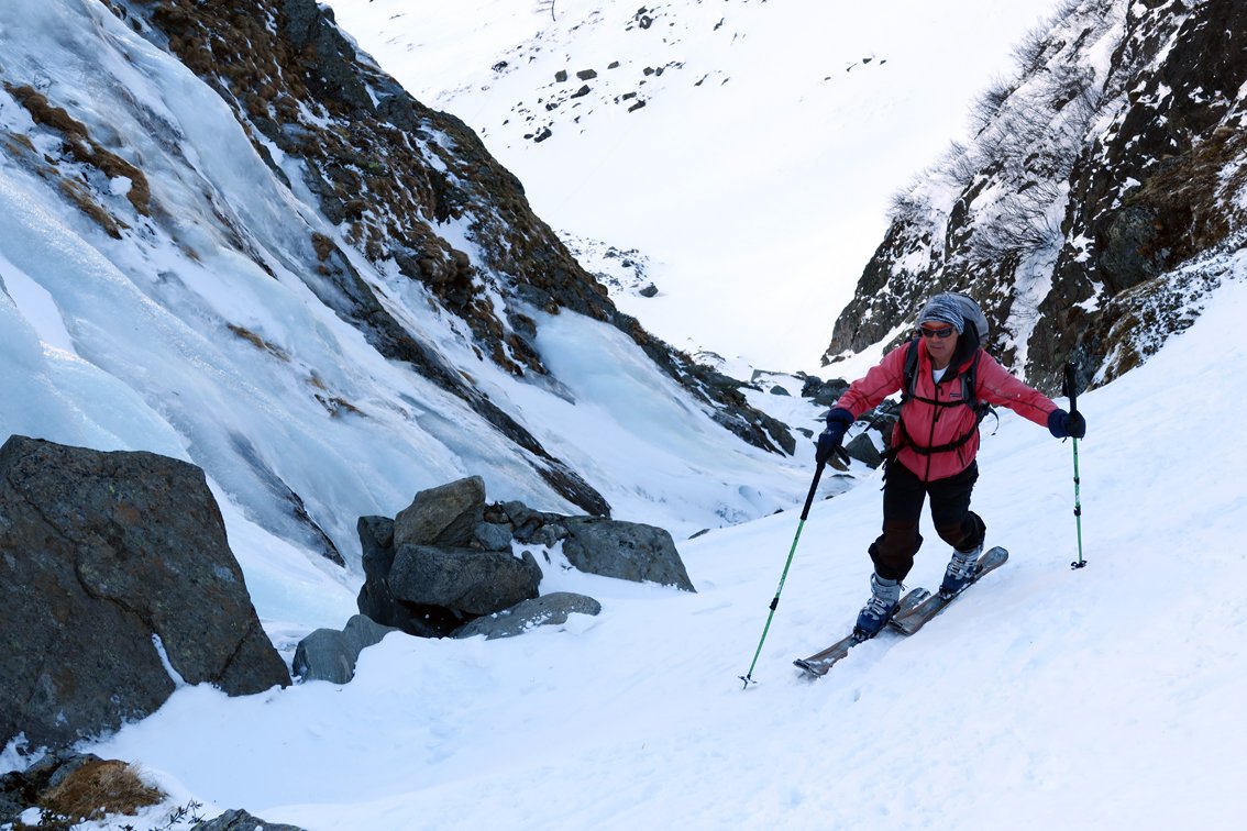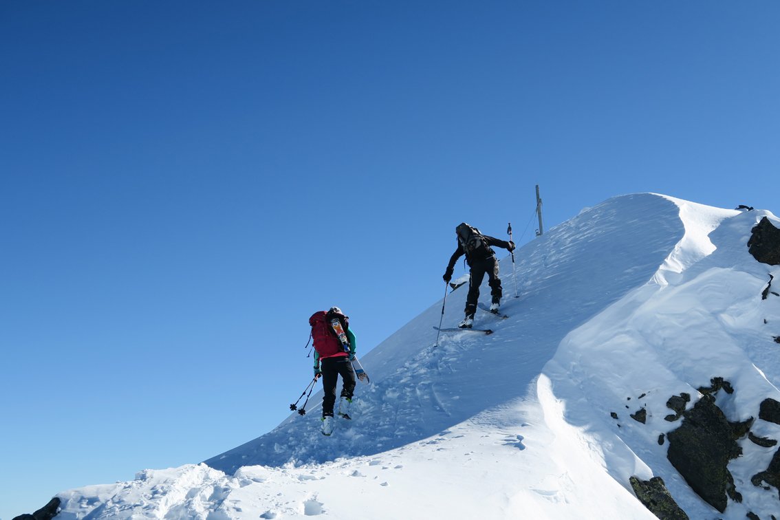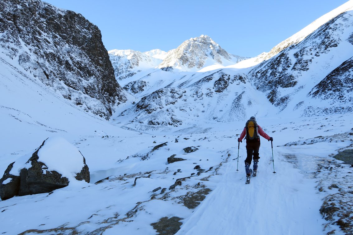 Normale Skitourenausrüstung, auf jeden Fall Harscheisen für die oft vereiste Steilstufe der "Zwing" (evtl. könnten auch Steigeisen nötig sein).